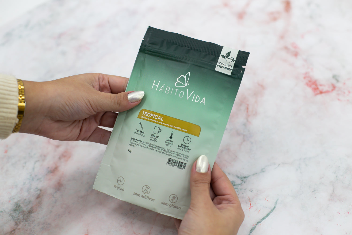Esse blend é composto por hibisco, maçã, abacaxi, hortelã e stévia.