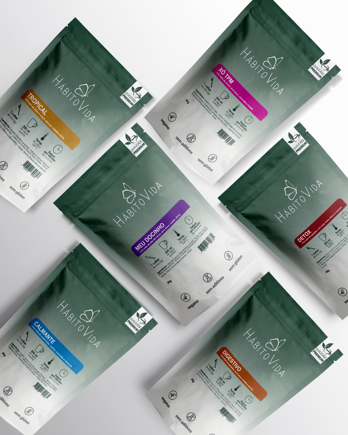 Detox, Digestivo, Meu Docinho, Calmante, Tropical e Xô TPM: combinações que equilibram corpo e mente, trazendo leveza para todos os momentos do dia.