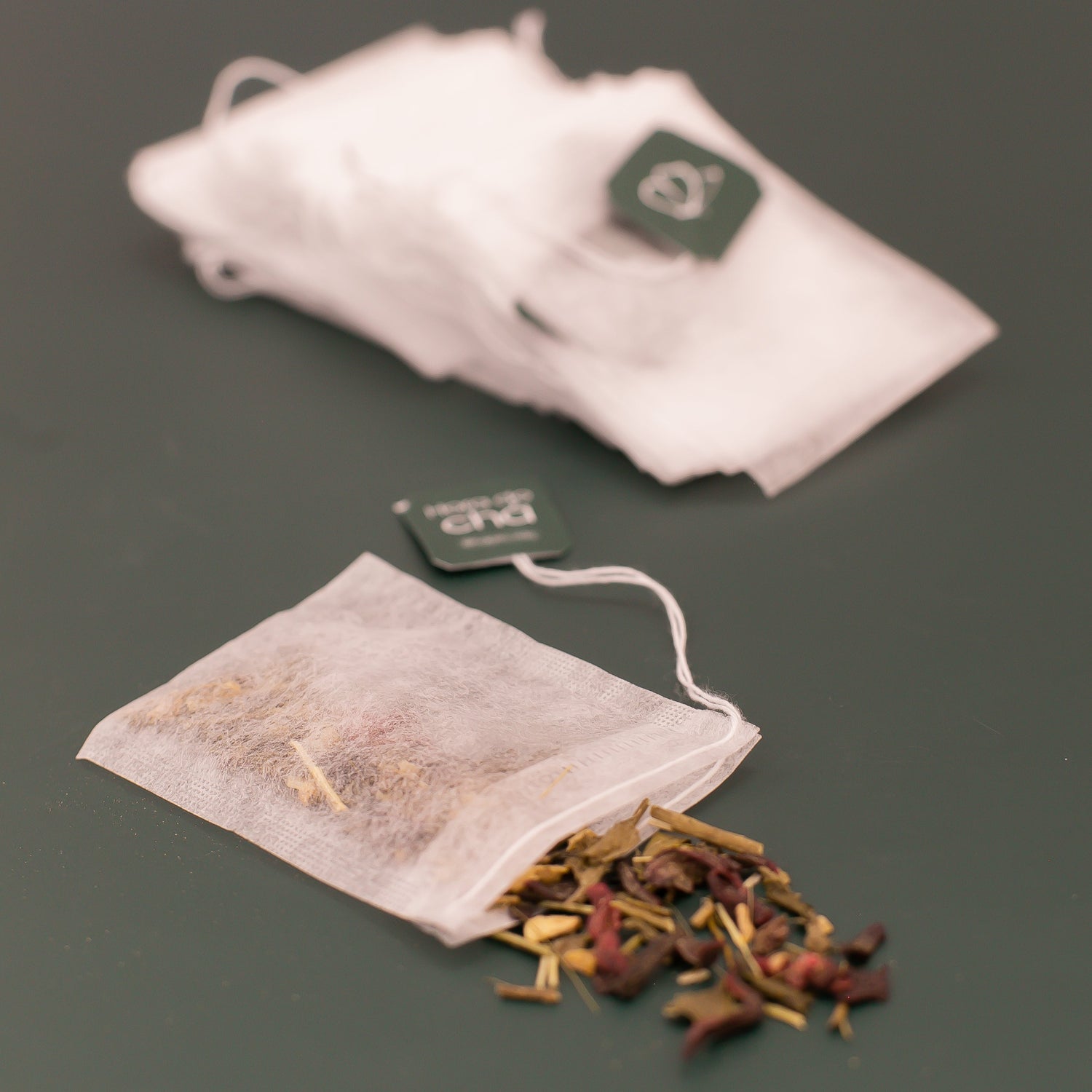 Saquinhos biodegradáveis de fibra de milho, perfeitos para infusões com ervas soltas. São resistentes, higiênicos, não soltam resíduos e vêm com cordão para fechamento seguro.