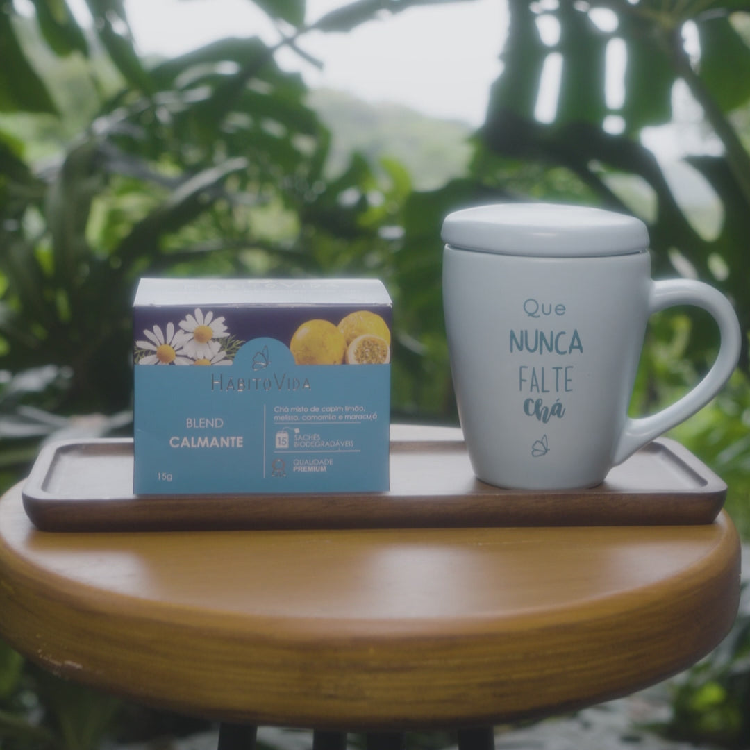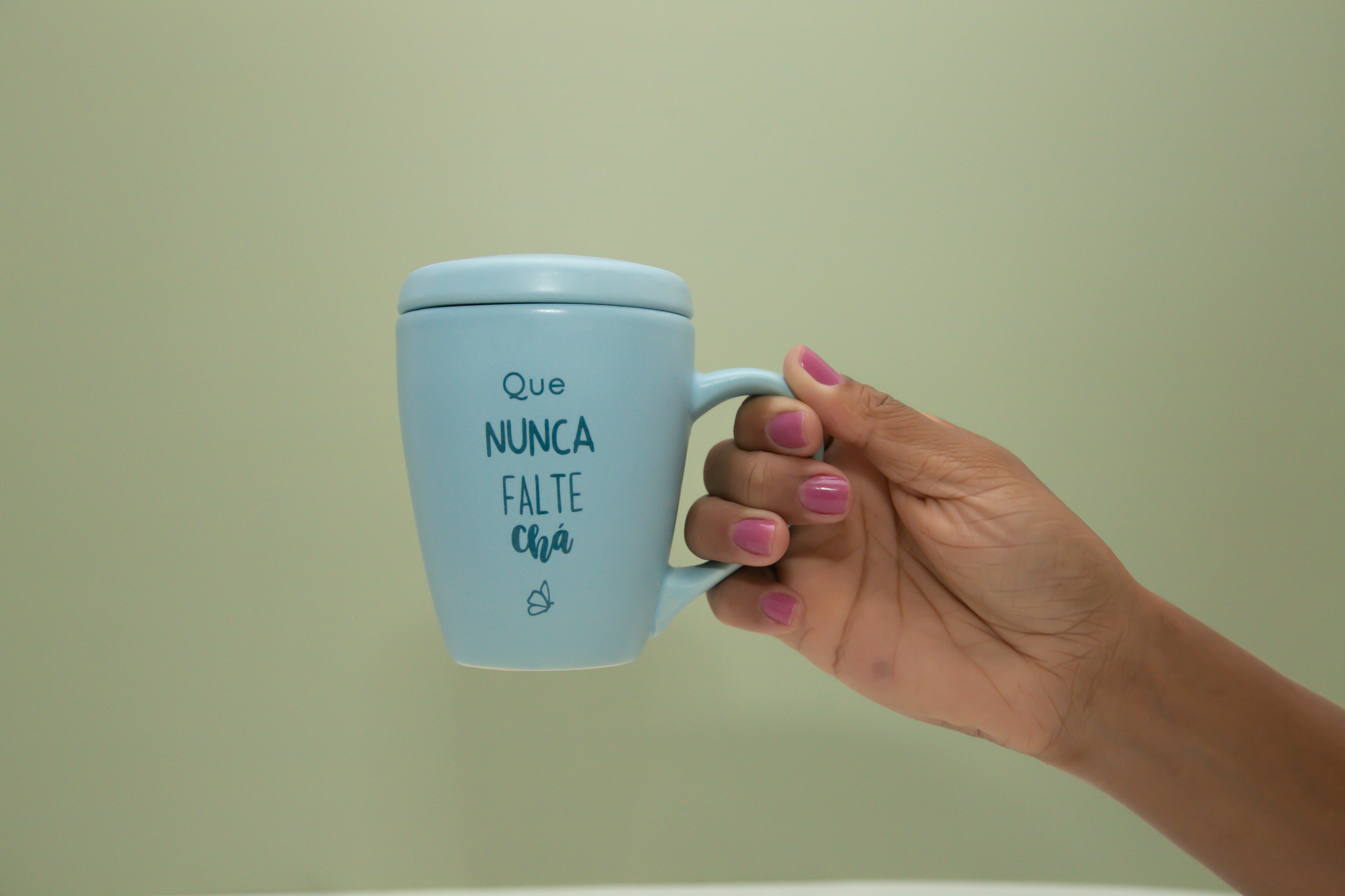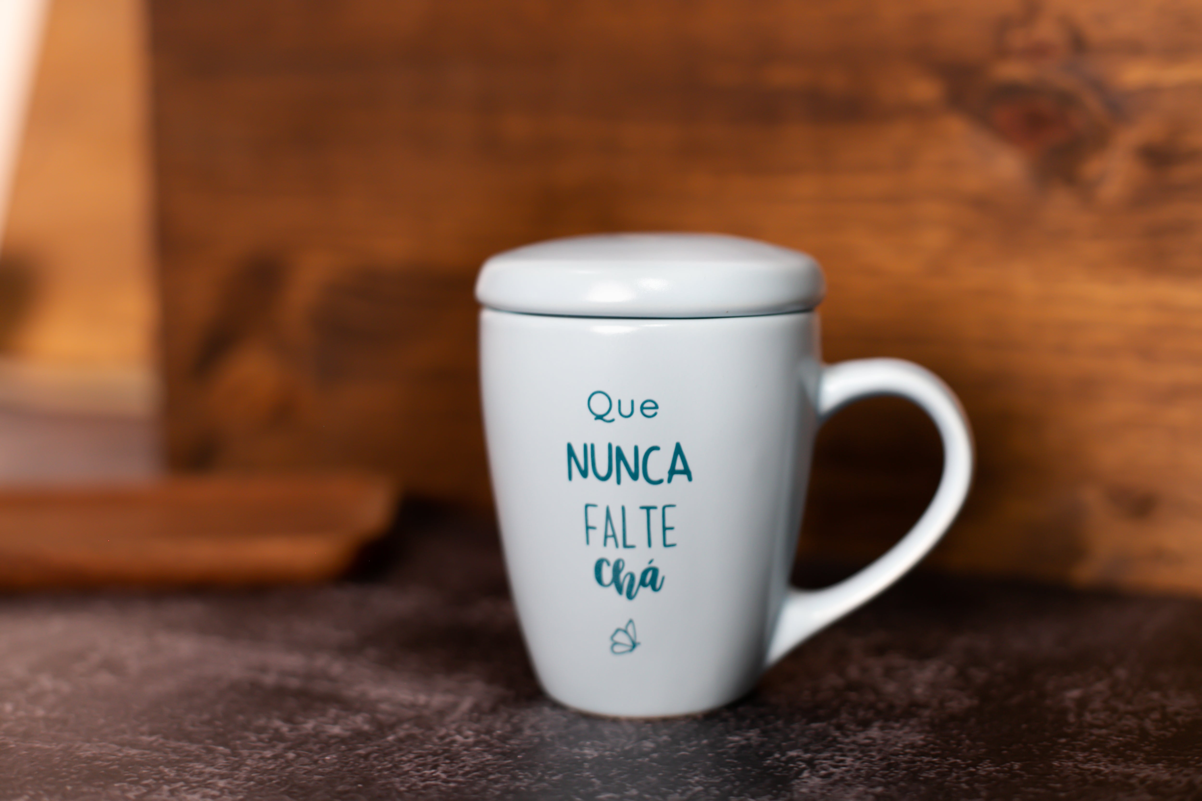 Caneca de porcelana com tampa, design único e exclusivo Hábito Vida. Para quem ama chá, nossa caneca é linda e apaixonante. Para mais informações acesse a descrição: