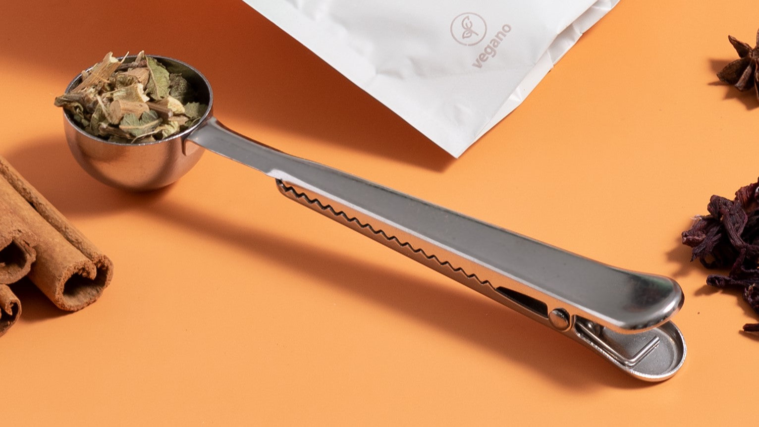 Descrição da Colher Medidora para Chá - com Grampo Prendedor